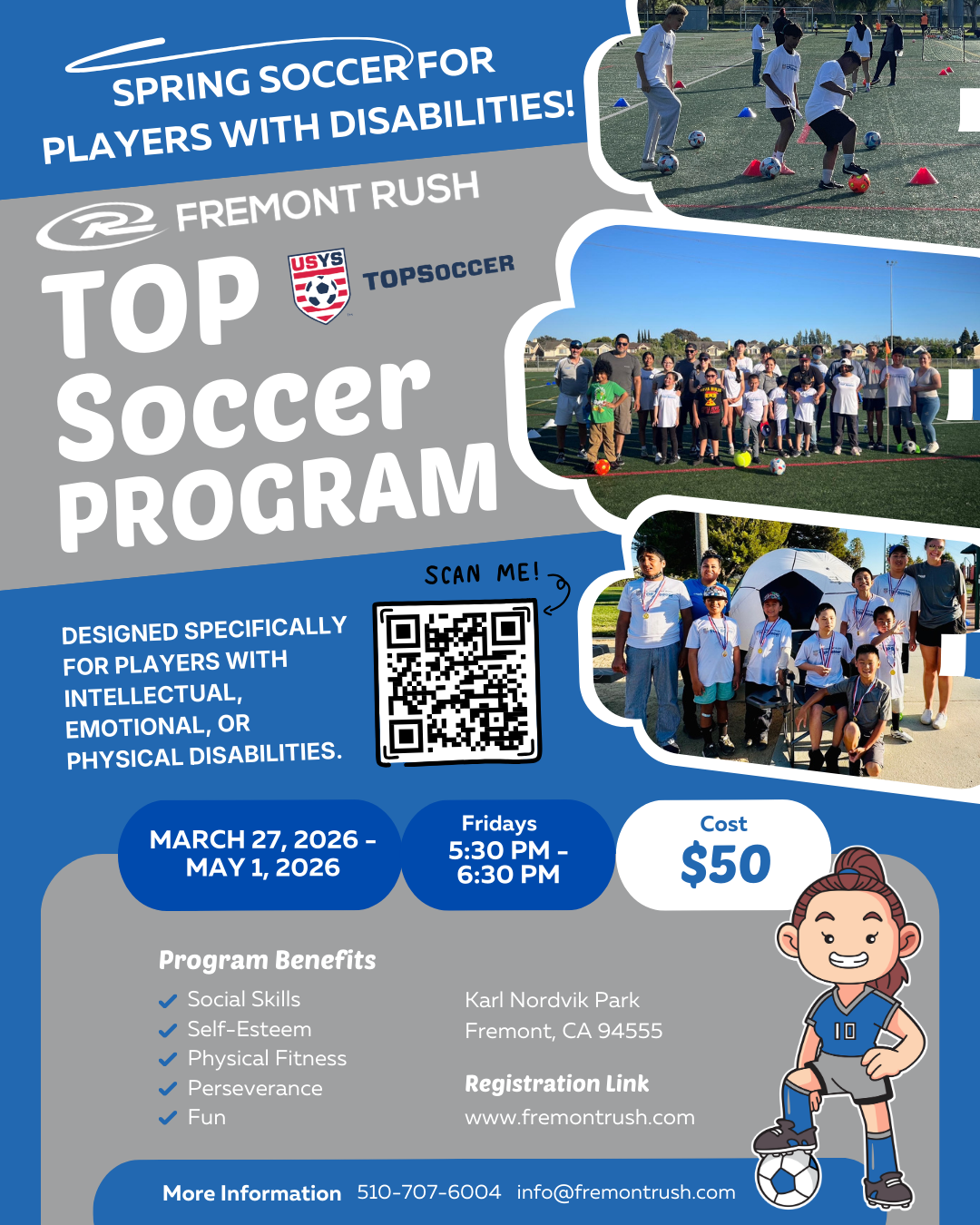 Boys and girls ages 5-18 with disabilities who cannot fully participate in mainstream soccer. Fremont Rush’s TOPSoccer program, operated with USYS and Cal North, is led by certified trainers and volunteers. All players are registered with Cal North for secondary insurance coverage.